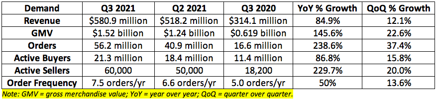 This was the highest active user growth rate that the company has posted over the last 7 quarters (comparing to other periods of severe pandemic pain) and the 7th consecutive quarter of total order growth over 100%.