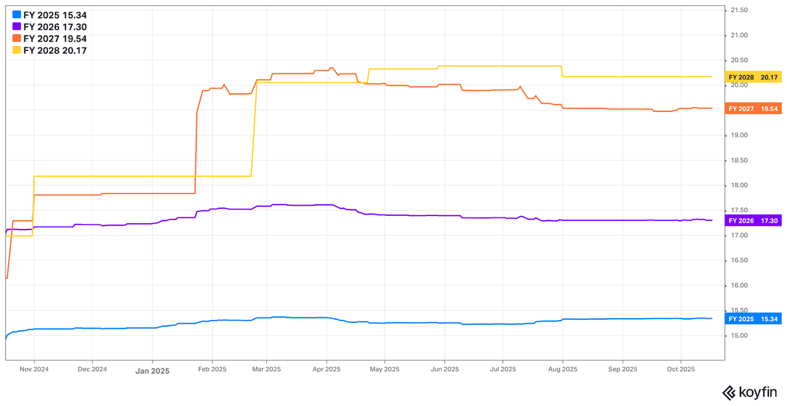 Thanks to the strong Q3 performance, it raised annual revenue growth guidance from 9% Y/Y to 9.5% Y/Y. That compares favorably to 8.5% Y/Y growth estimates. It also raised $15.25 EPS guidance to $15.35 (about 15% Y/Y growth), which met estimates. Estimates for both 2025 and 2026 are up modestly year-to-date
