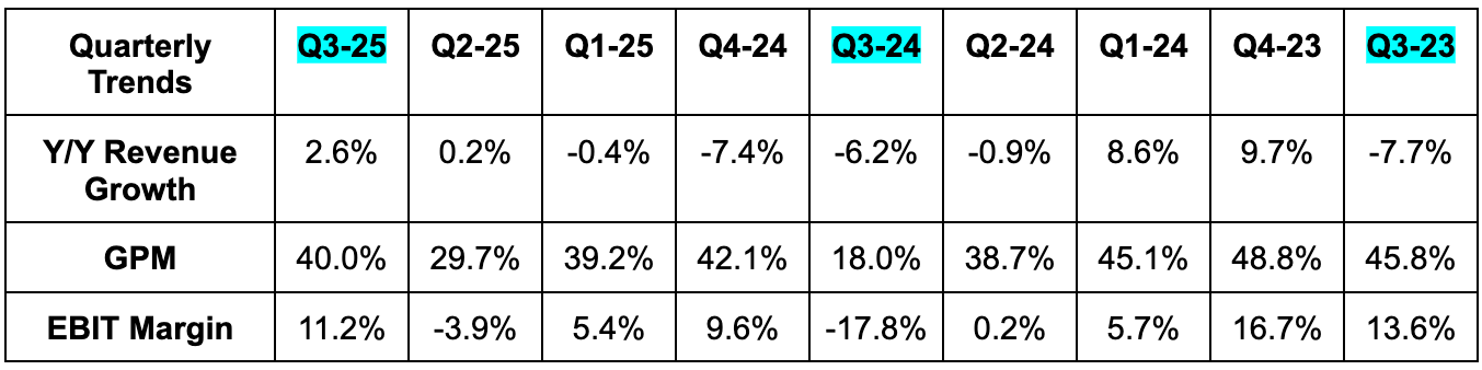 - 36.5% GPM guidance missed estimates by 50 bps.
