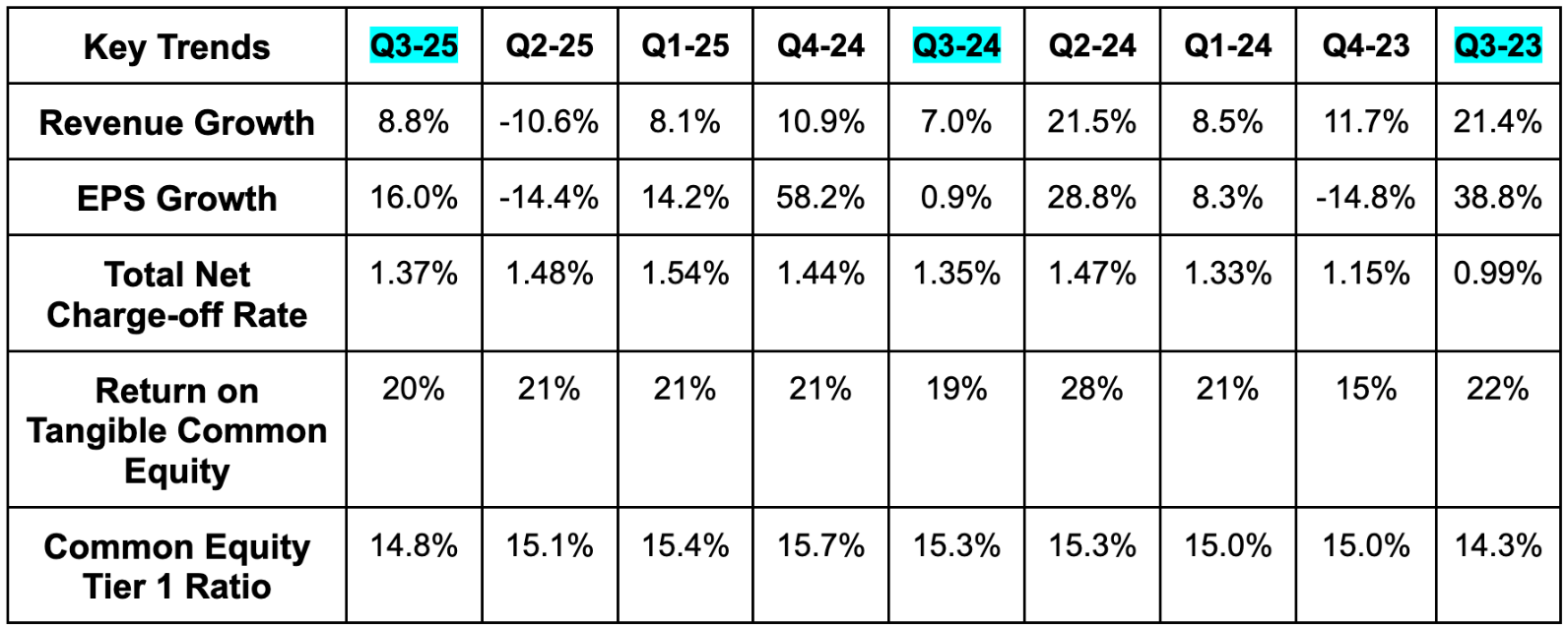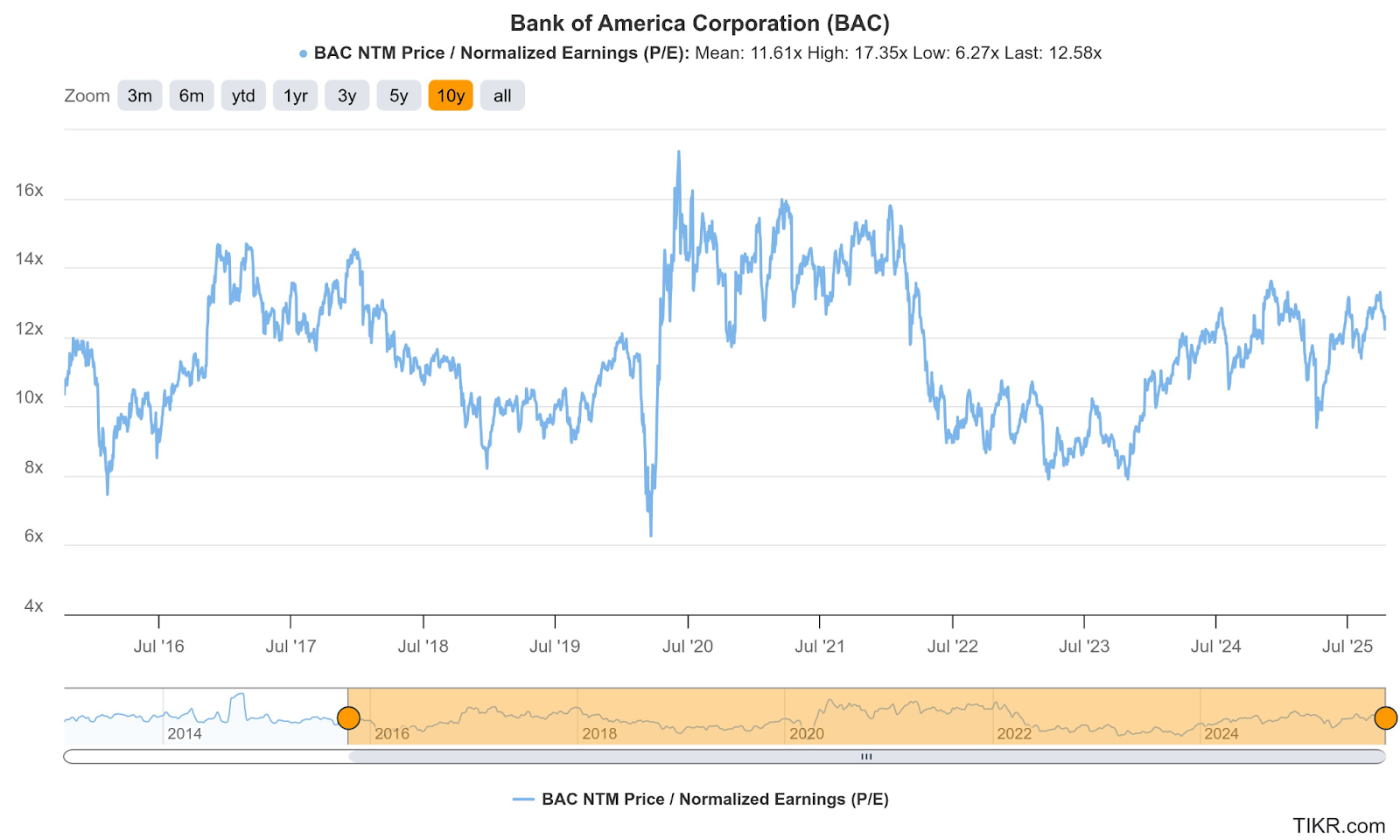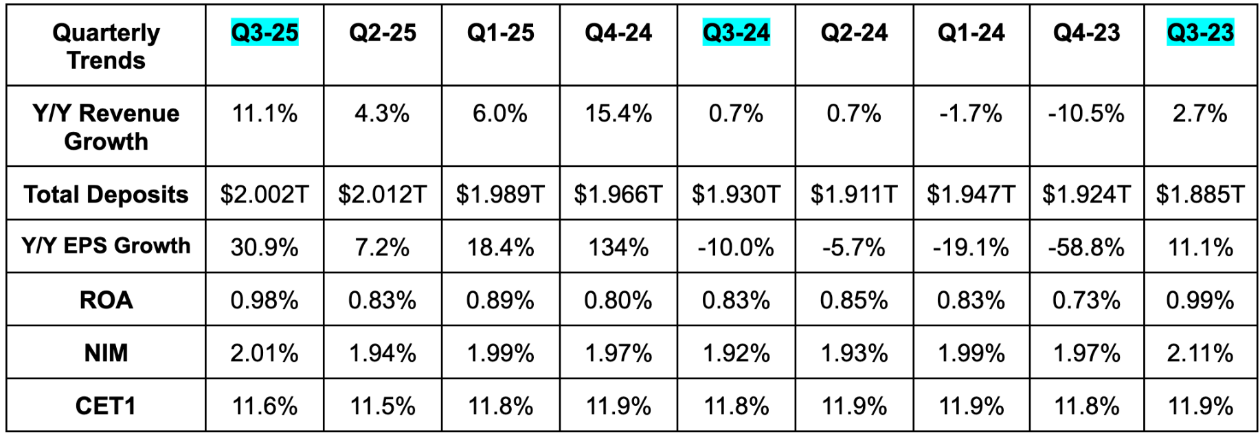 Bank of America raised its Q4 net interest income guidance from $15.6B to closer to $15.7B. This would represent about 8% Y/Y growth for Q4. For 2026, they expect to replace about $10B-$15B in assets with higher-yielding products, which should allow them to maintain 2026 growth that’s similar to 2025. Specifically, they guided to roughly 5%-7% growth for next year. BAC trades for 12x forward EPS.