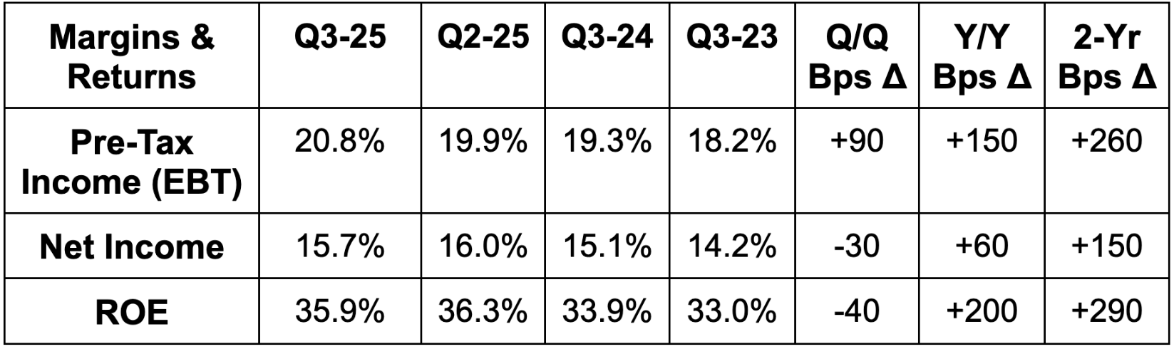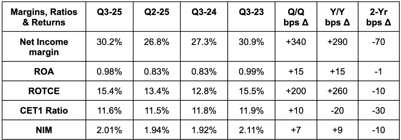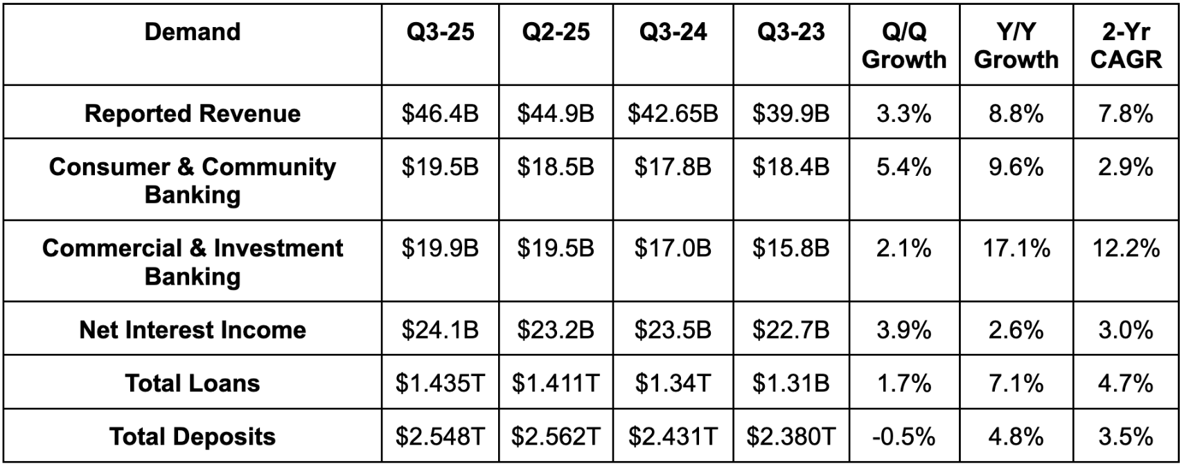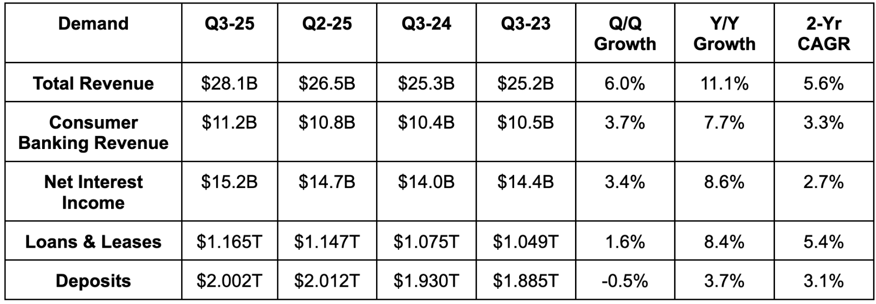 Bank of America raised its Q4 net interest income guidance from $15.6B to closer to $15.7B. This would represent about 8% Y/Y growth for Q4. For 2026, they expect to replace about $10B-$15B in assets with higher-yielding products, which should allow them to maintain 2026 growth that’s similar to 2025. Specifically, they guided to roughly 5%-7% growth for next year. BAC trades for 12x forward EPS.