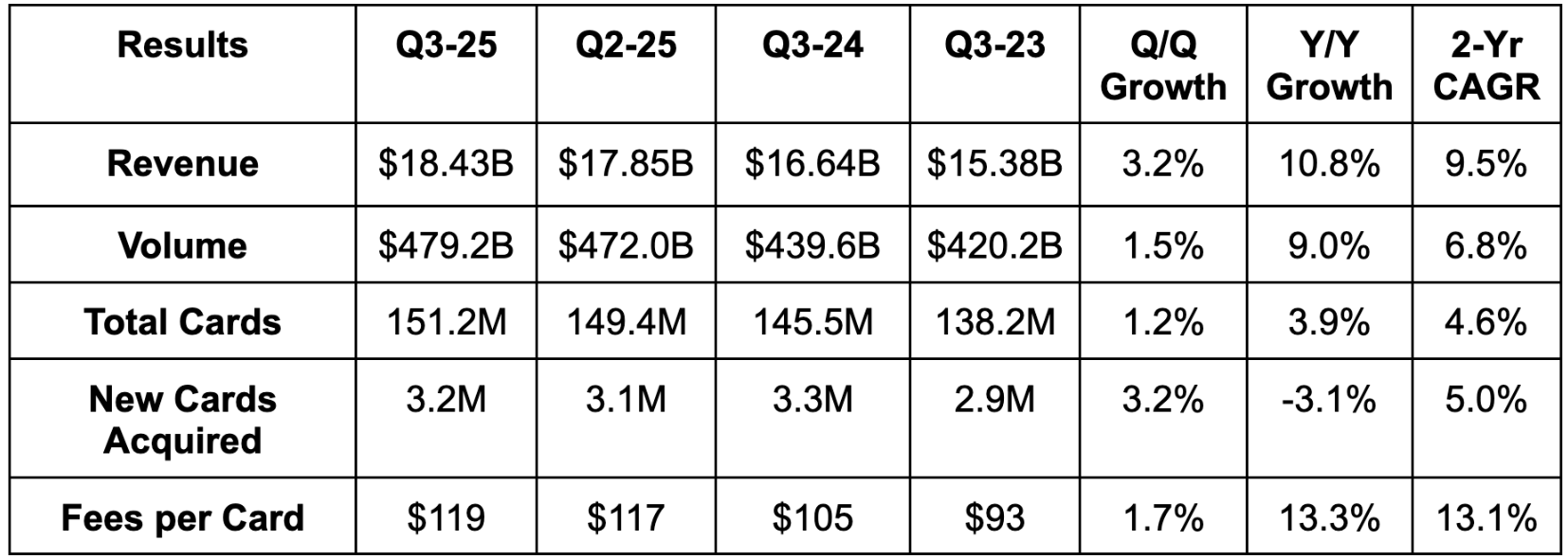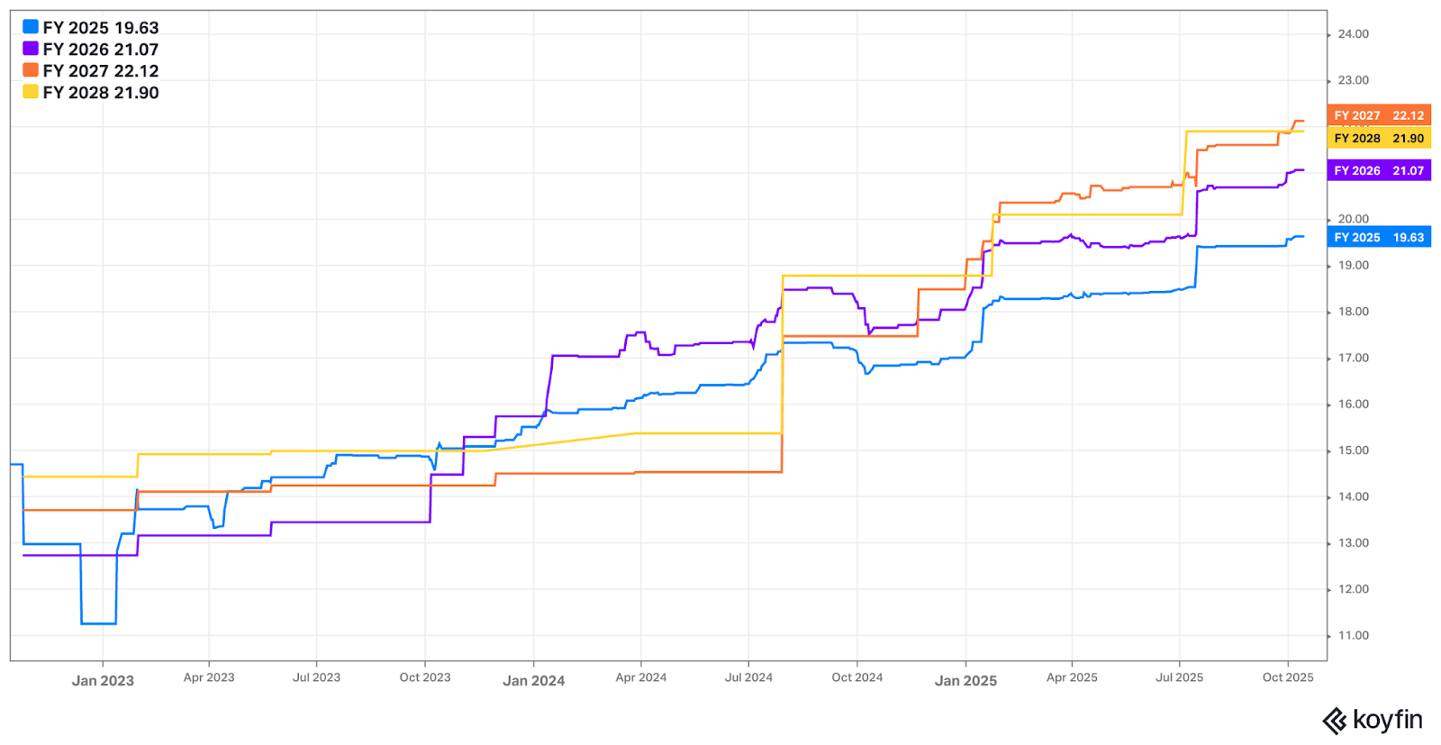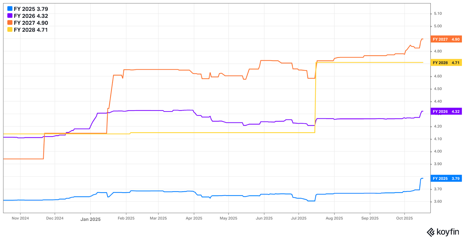 Thanks to the strong Q3 performance, it raised annual revenue growth guidance from 9% Y/Y to 9.5% Y/Y. That compares favorably to 8.5% Y/Y growth estimates. It also raised $15.25 EPS guidance to $15.35 (about 15% Y/Y growth), which met estimates. Estimates for both 2025 and 2026 are up modestly year-to-date