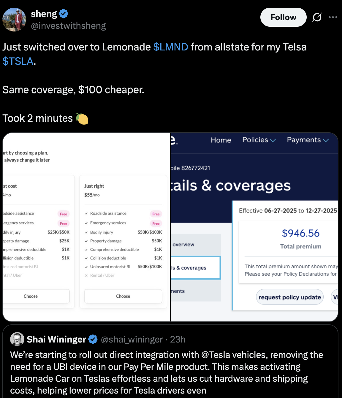 Others are allowed to build what Lemonade just built using the same Tesla API. The integration certainly isn’t only available to this specific company. That’s not why this is exciting. It’s exciting because it’s another signal of Lemonade’s ability to build slick integrations like this while others haven’t done nearly as good of a job. Incumbents can’t easily bend their applications to connect to other modern systems like Tesla’s. They can, and do, get part of the way there… but not all the way. Nobody else matches the onboarding ease, lower hardware needs, extensive data collection and lower Lemonade pricing. Others can match some of that equation… but not every piece. That should be a compelling offering for Tesla owners.