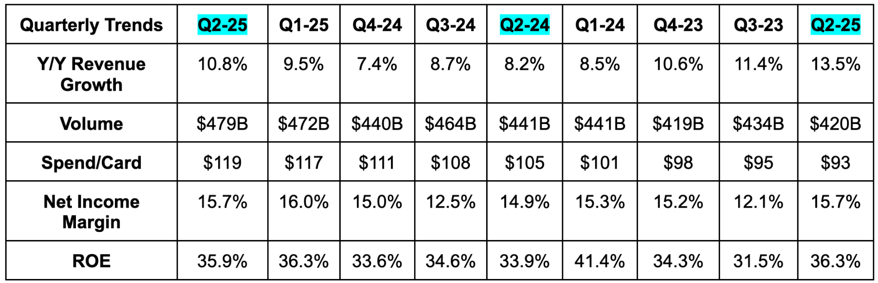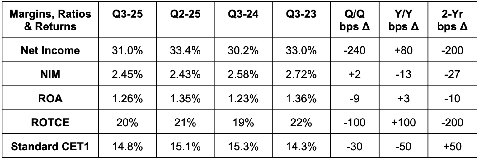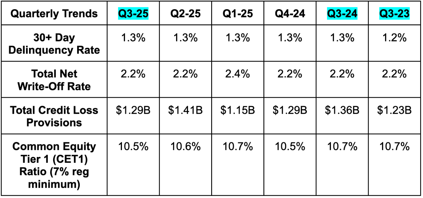 It’s great to see NCO meaningfully tick down on a sequential basis alongside card service NCO. Improving card service NCO guidance for the year was equally encouraging. Provisions continue to rise, which is something to keep an eye on, but generally speaking, credit metrics look at equity resilience on a Q/Q and Y/Y basis. Encouraging.