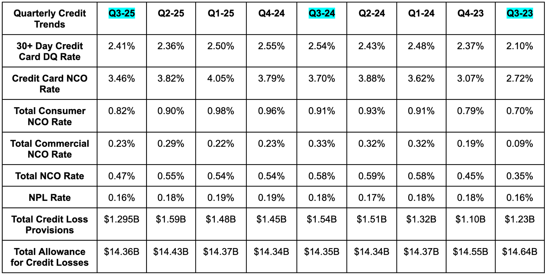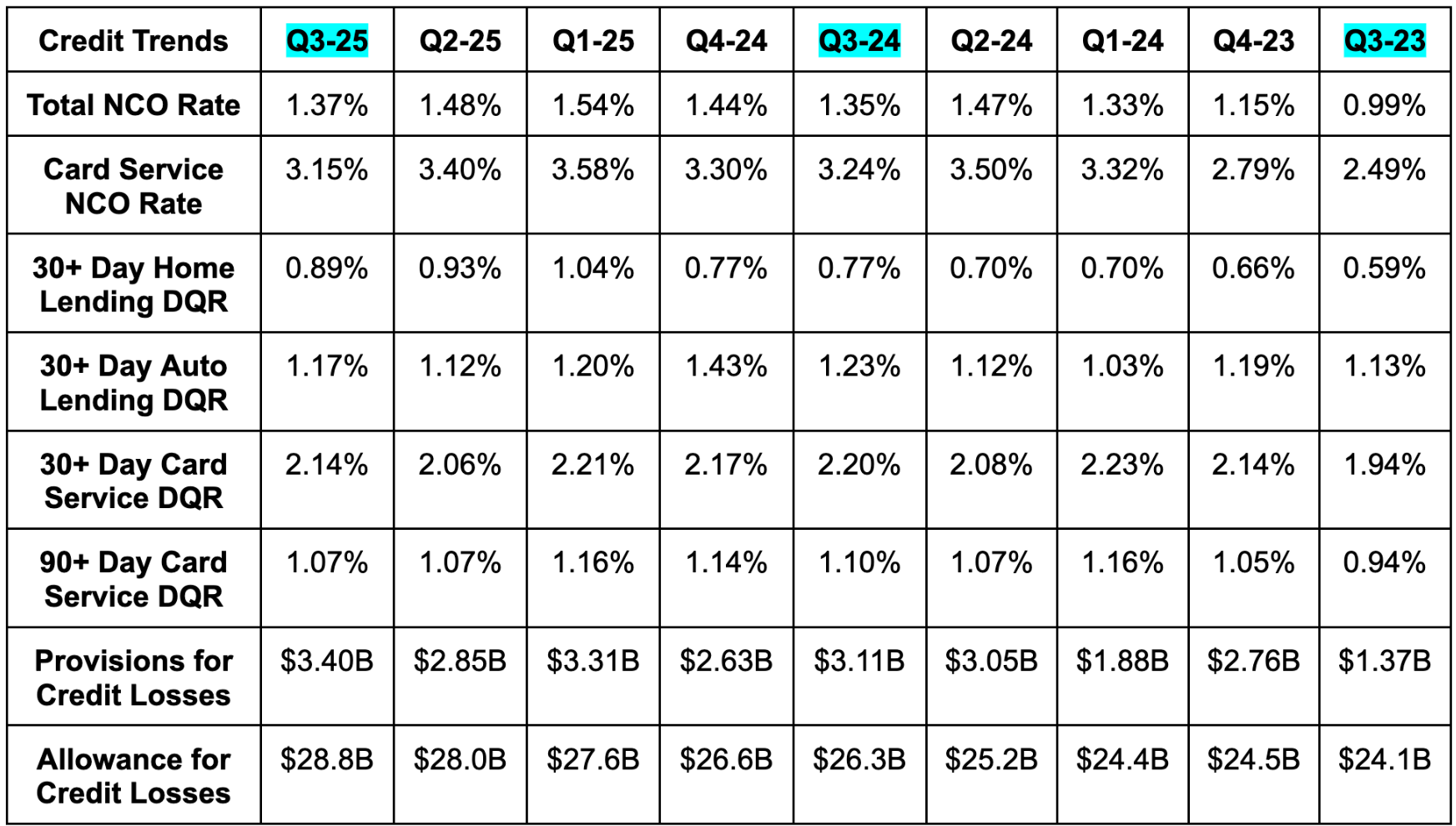 The data below looks good. 30+ day card delinquency rates and non-performing loan (NPL) rates both improved meaningfully on a Y/Y basis, while NPL matched its best result in 2 years. Credit card NCO reached its best level in over a year. Both consumer and commercial NCO data looks resilient and improving, while overall provisions are falling, which points to reasonably strong expectations for future repayment. For a giant consumer bank, this bodes quite well for durable consumer credit health.