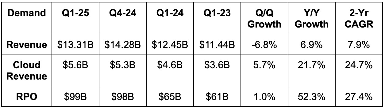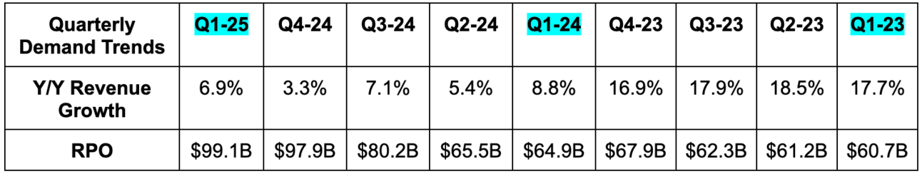 - Oracle reiterated annual expectations for 10%+ revenue growth, which compares strongly to 9.4% Y/Y growth expectations. It also reiterated faster than 50% cloud growth for 2025.