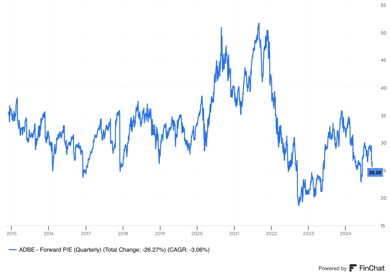 Adobe trades for 27x forward earnings. Earnings are expected to grow by 12% this year and by 13% next year.