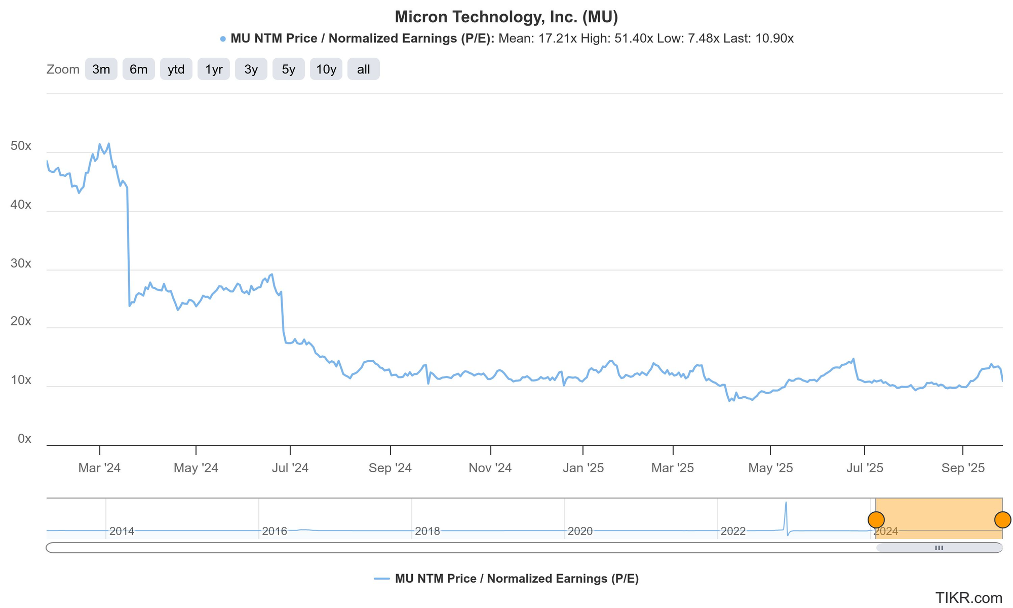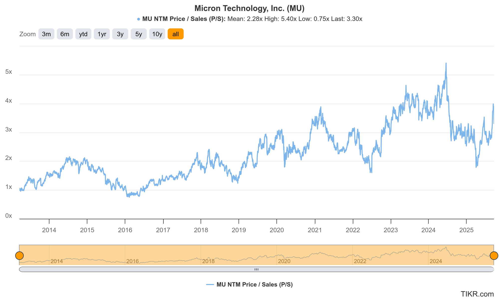 Micron trades for 11x forward EPS. EPS is expected to grow by 97% this year and by 9% next year.
