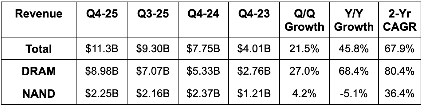 For this calendar year, Micron raised server unit growth expectations from roughly 5% to 10%. The outperformance is coming mainly on the DRAM side. Within DRAM, both traditional and AI server demand surpassed leadership expectations and contributed to this raise. While it’s interesting that traditional server demand is accelerating, that’s actually also partially related to AI. The explosion in AI agents indirectly expands usage of these legacy workloads for their own multi-step workflows. And while the agents themselves are autonomous and AI-based, they’re still using traditional software to complete work on a user’s behalf. Finally, demand for traditional server-based apps is also strengthening. So… to summarize... everything is going better than expected throughout the entire DRAM business.