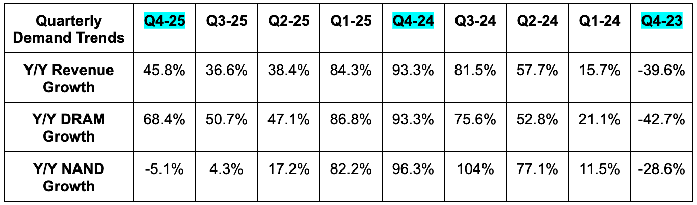 It raised calendar year (not the same as fiscal in this case) 2025 DRAM bit growth. It still guided to high-teens growth, but called this new guidance “somewhat higher.” For NAND calendar 2025 bit growth, it raised growth from 11%-12% to around 14% Y/Y. Supply growth will lag demand growth for the rest of the year, which should support strong pricing. For calendar year 2026, they believe that supply dynamics for DRAM will remain very tight while demand conditions for DRAM and NAND “strengthen.” Over the long haul, they continue to forecast ~15% DRAM and NAND growth.