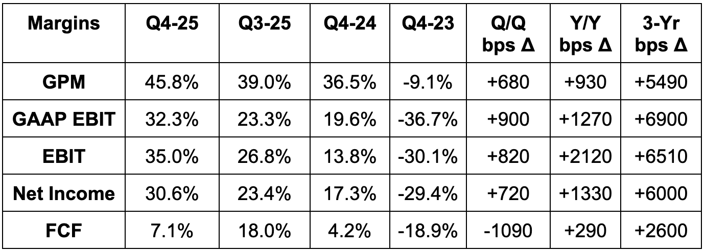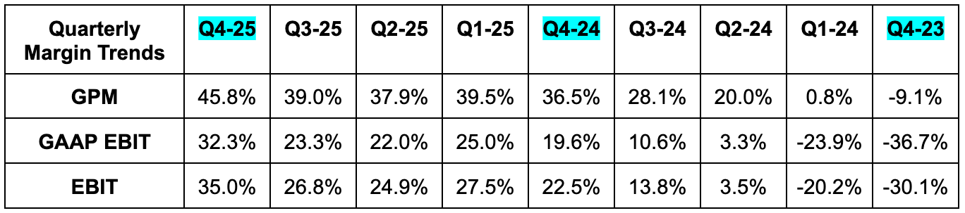 Its NAND SSDs reached record market share, while mix-shift to data center revenue led to stronger margins. MU’s NAND suite is becoming increasingly popular for vector-based search (formatted in a way so AI models understand) and data cache tiering to minimize data storage costs. This is driving market share gains and higher-quality revenue. AI inference is still in its infancy and traction for these specific use cases should mean Micron’s NAND takes an encouraging piece of that memory demand opportunity.