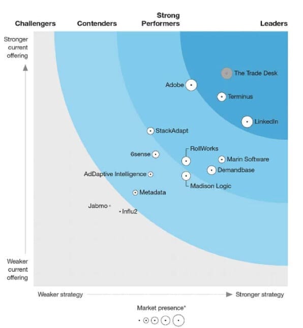 The report read like a sales pitch for The Trade Desk with language like “the company makes B2B advertising more scalable and targetable” and “it’s leading visionary initiatives to benefit B2B advertising.” Forrester also praised the company for its ability to integrate with agencies that serve demand of all sizes so that the smallest of businesses can access these lucrative tools. When you read through the rest of the company reports, Forrester was not NEARLY as complimentary.