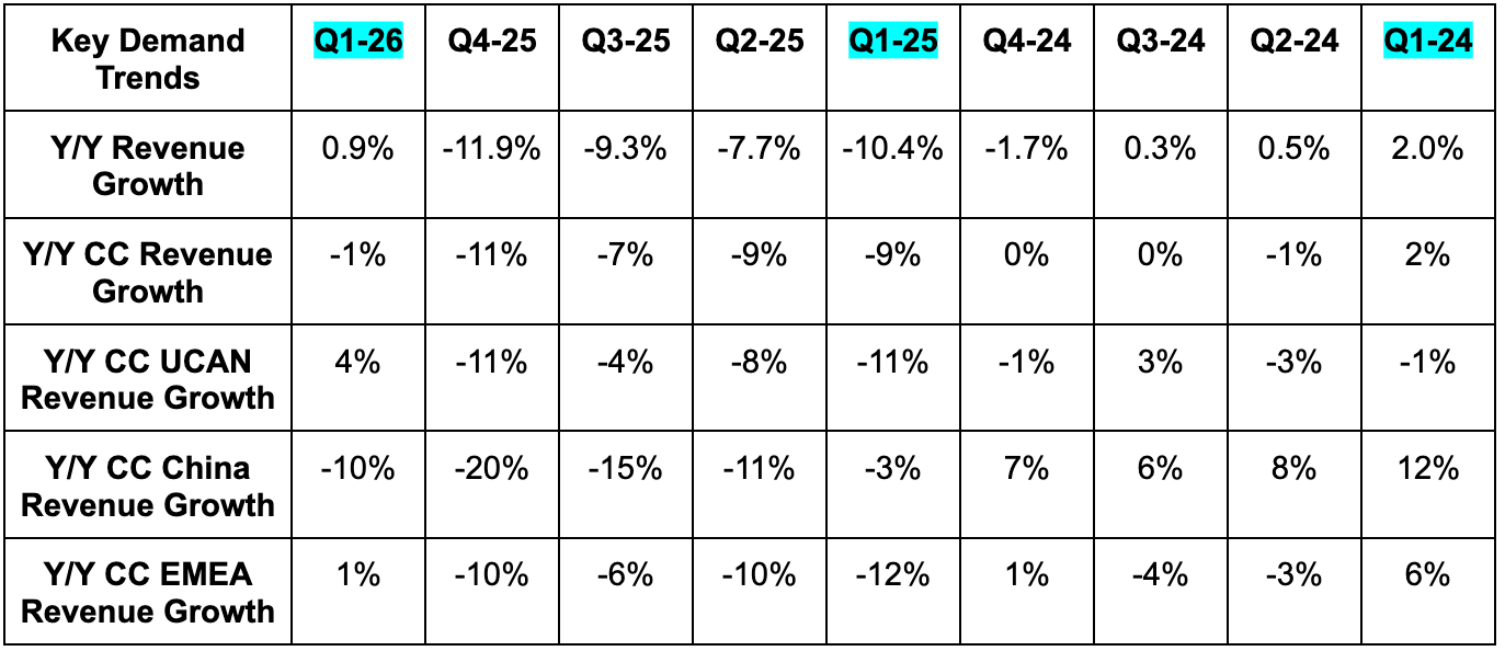 China is probably the market with the most remaining work to do. Running delivered nearly 10% Y/Y growth in the market, but EBIT fell by 25%Y/Y and everything else struggled. They’re in a tough situation there right now with double-digit declines in shopper traffic and underwhelming conversion rates as well. They are investing in stores and product assortment to better cater to the Chinese consumer. At the same time, it will take a while for changes to be implemented across its large 5,000-store footprint. And after that, it will also take a while for consumer awareness to build and for sales trends to respond. That means a lot of near-term cost without a lot of near-term financial contribution, hence the bad numbers