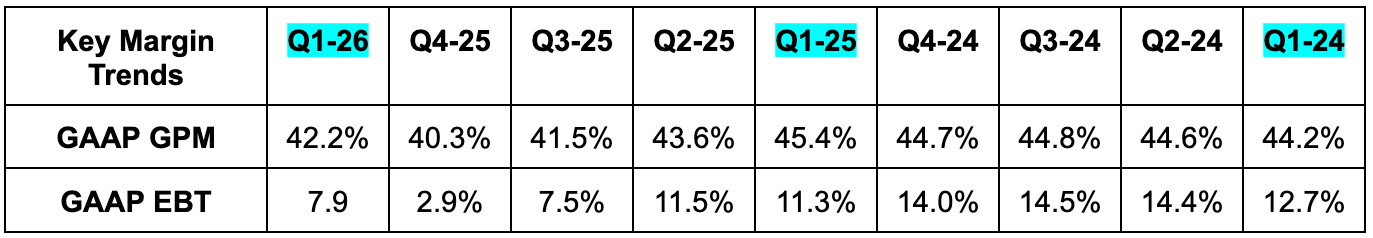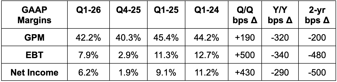 - Guided to about 340 bps of Y/Y GPM contraction, vs. 220 bps expected. This is related to incremental tariff headwinds discussed below. Between this and high single-digit SG&A expense growth guidance, Q2 net income estimates fell by about 28%. At the same time, the large Q1 beat and low single-digit full-year SG&A growth guidance led to full-year 2026 net income estimates modestly rising.