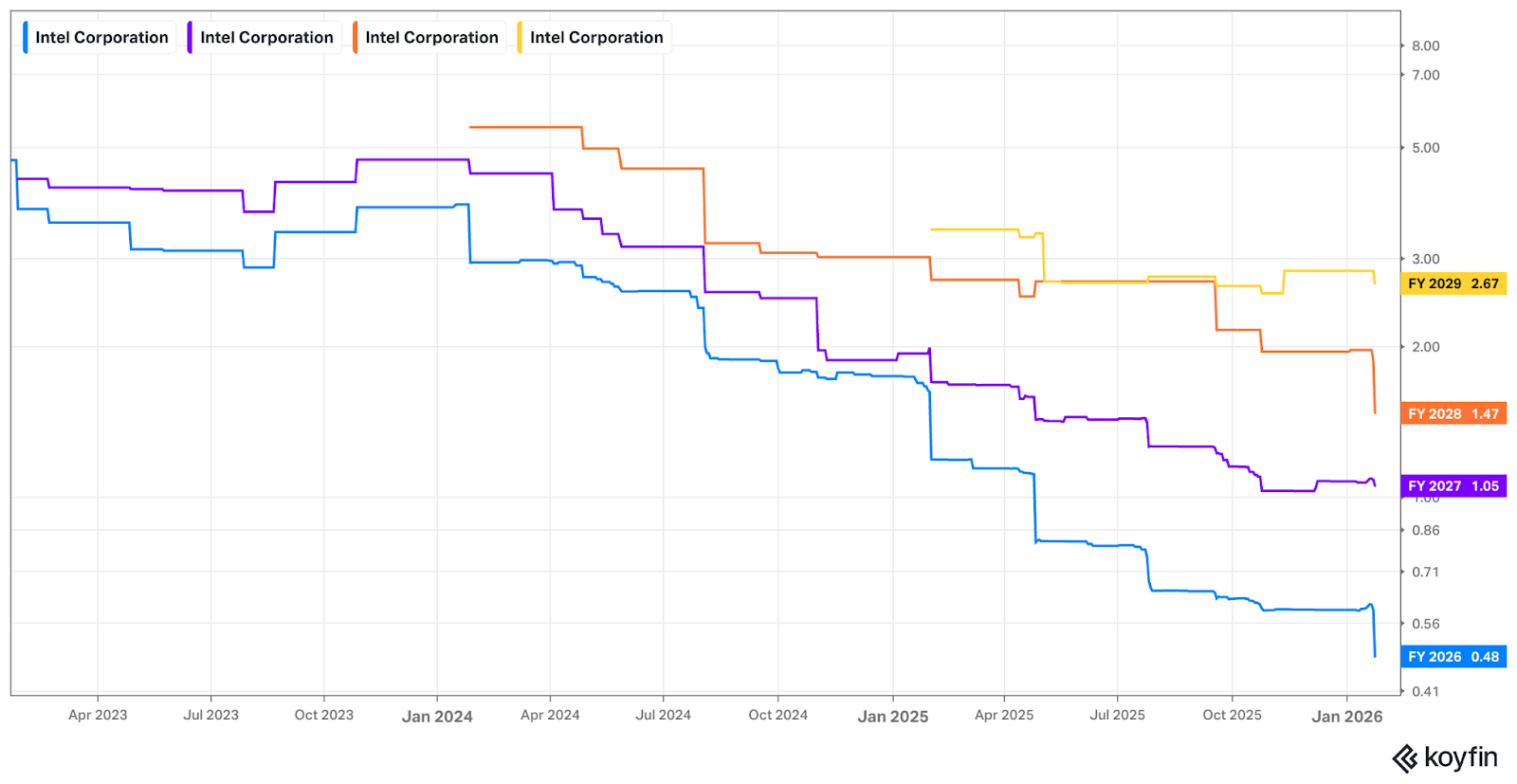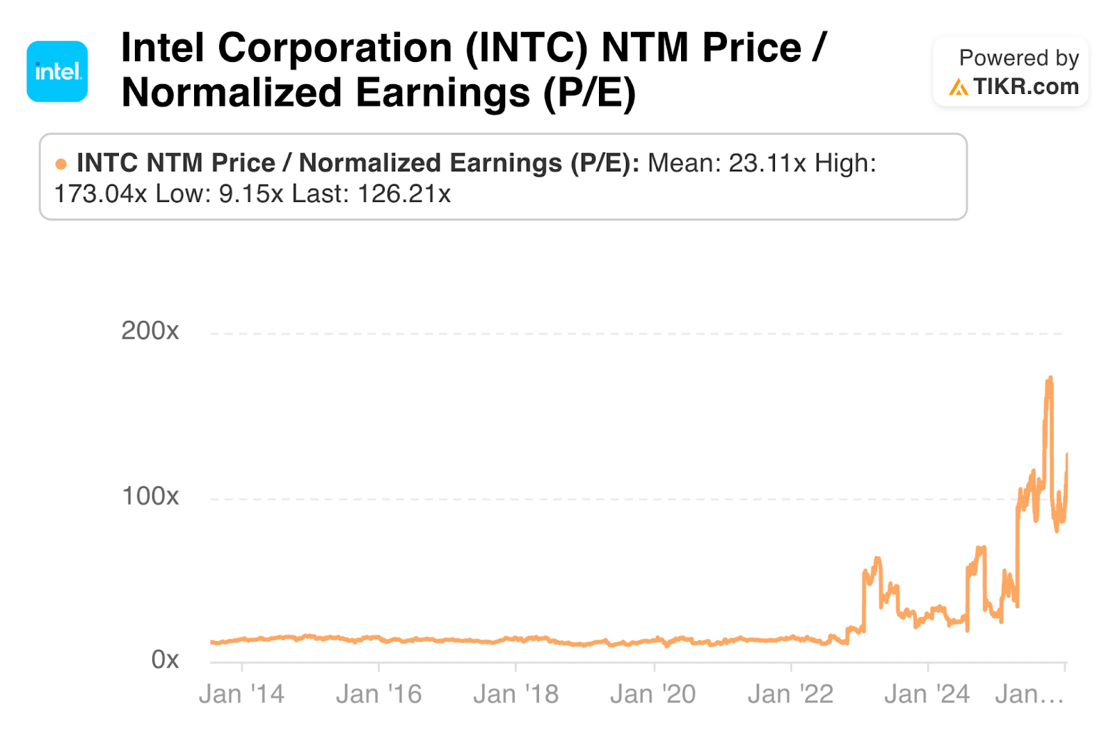 Intel trades for 126x forward EPS as they aggressively invest in their future and struggle to capture near-term demand. As of right now, EPS is expected to grow by 14% this year and by 119% next year.