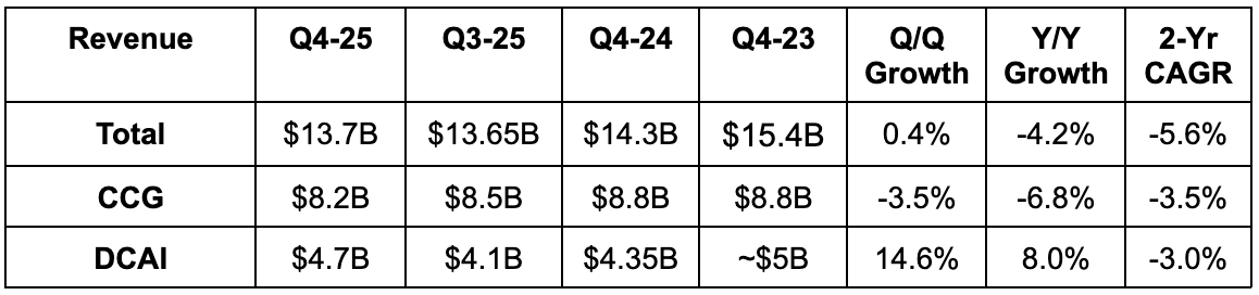 - Data Center AI (DCAI) revenue beat estimates by 20%.