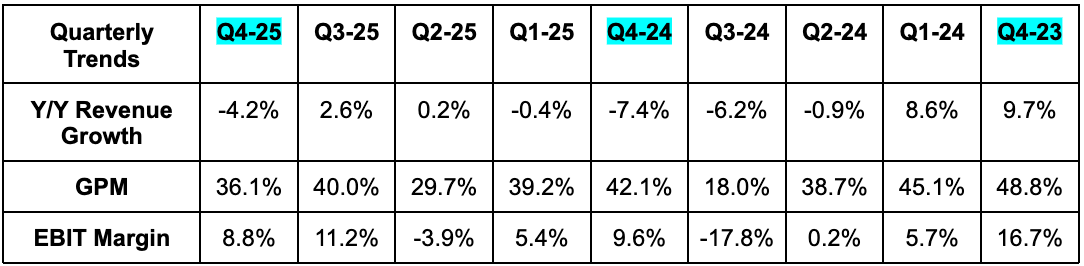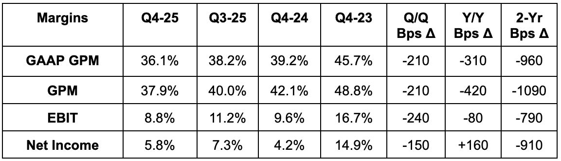 For next quarter, revenue guidance missed by 3%, $0 EPS guidance missed by $0.05 and 34.5% GPM guidance missed by about 2 points.