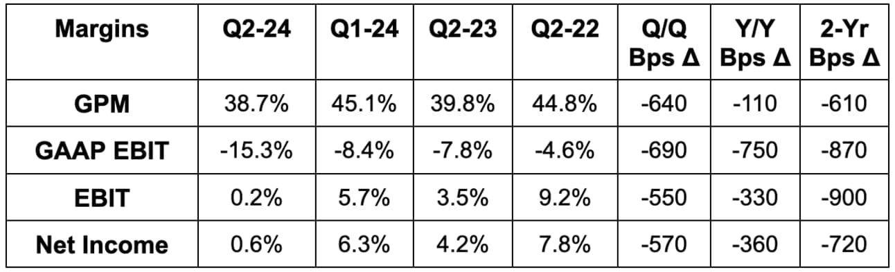- Q3 gross margin guidance of 38.0% sharply missed estimates.