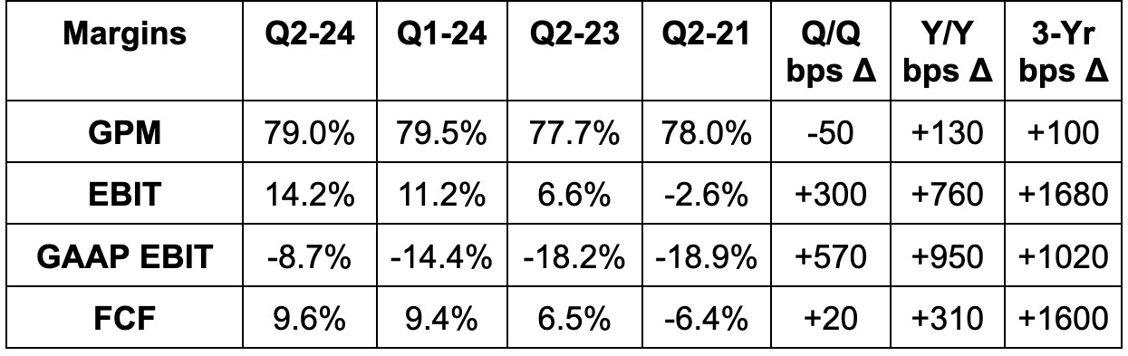 - Beat 78.5% non-GAAP GPM estimates by 50 basis points (bps; 1 basis point = 0.01%).