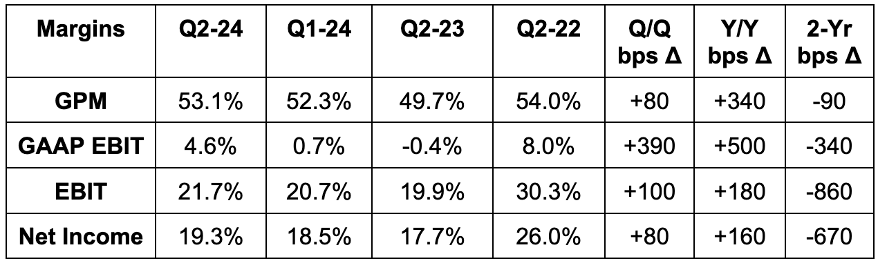 Q3 revenue guidance beat by 1.5%, while its 53.5% GPM guide missed 54.0% estimates.