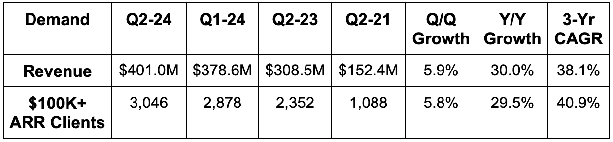 - Remaining performance obligations (RPO) (forward-looking demand metric) rose 37% Y/Y to $1.41 billion.