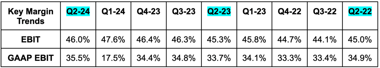 - Missed FCF estimates. This metric is very lumpy on a quarterly basis. Best to focus on trailing 12-month, annualized FCF. This quarter, FCF was held back by $830 million in M&A-related charges. This was the source of the miss.