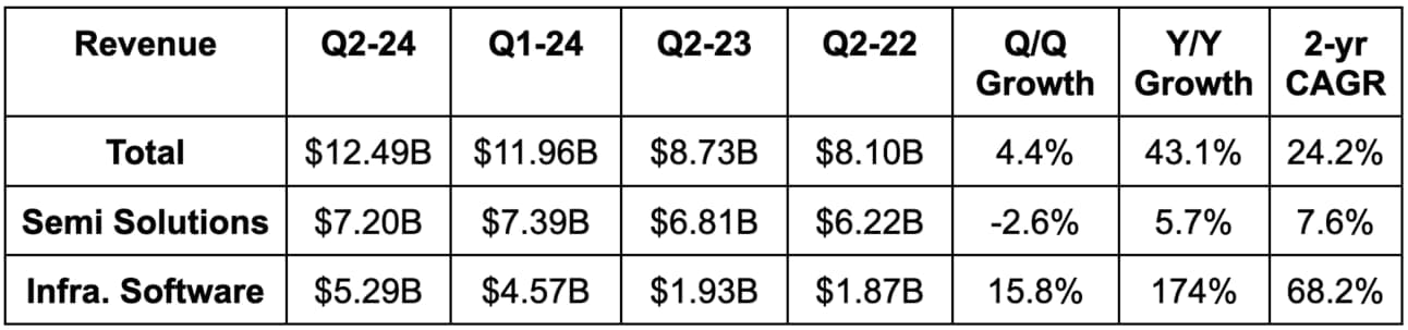 Broadcom’s VMWare acquisition is impacting several company metrics. It’s greatly benefiting overall revenue growth, as well as infrastructure software revenue growth. Even for the Q/Q comparison, a full quarter of VMWare contribution impacted growth materially. Finally, the acquisition is greatly hurting GAAP margins due to the M&A-fueled stock compensation, restructuring and integration costs.