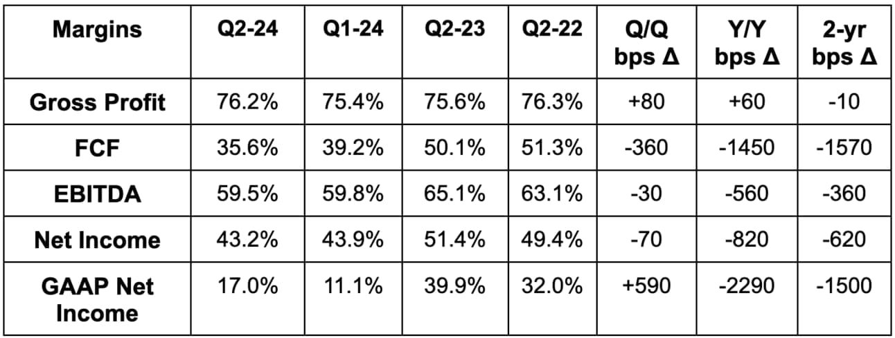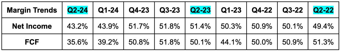 - Share count fell 1.8% Y/Y. It repurchased $2.5 billion in stock vs. $1.0 billion Y/Y.
