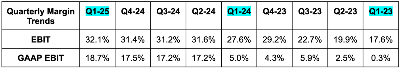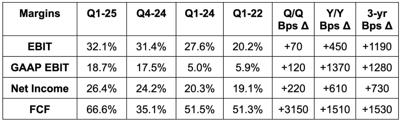 - Lowered annual GAAP EBIT margin guidance from 20.4% to 19.9%. This was related to lower-than-expected voluntary employee attrition, which isn’t all that concerning in my view.
