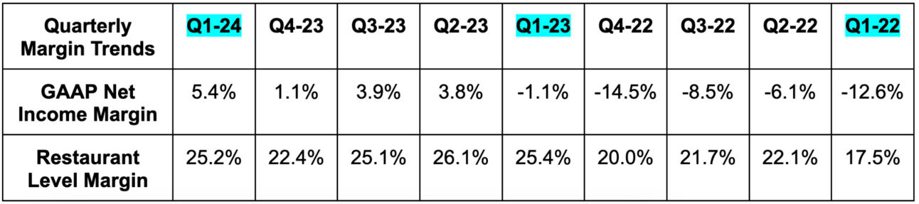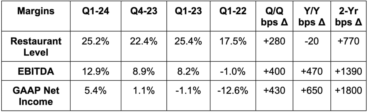 The restaurant-level margin decline was actually better than expected. The company has been telegraphing heavier labor investments (8% Y/Y wage growth) and store expansion investments as weighing on this margin line throughout 2024. It did get some help from food input costs this quarter, but sees that help vanishing for the rest of the year – largely due to its debuting of a steak dish. G&A as a percent of revenue was 13.1% of sales vs. 14.3% Y/Y. Less performance based stock compensation helped leverage here while more investments in growth offset the leverage a bit.