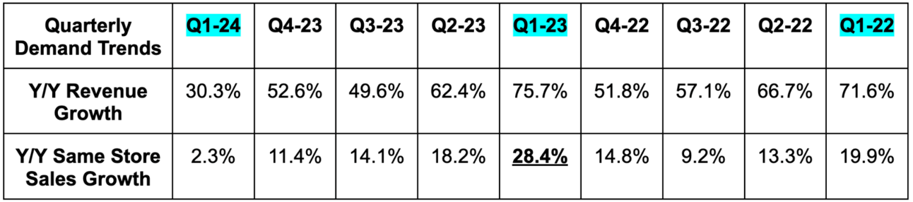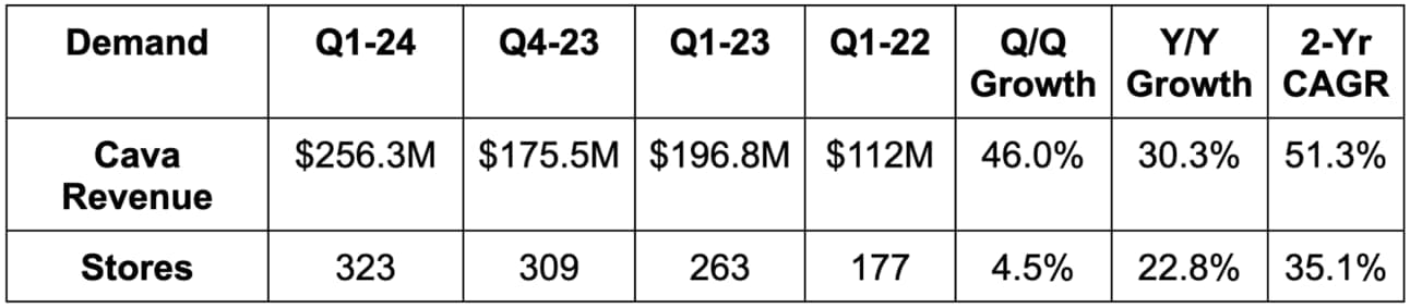 Cava beat revenue estimates by 4.4%. Its 51.3% 2-year revenue CAGR compares to 52.2% Q/Q and 53.3% 2 quarters ago. Note the same store sales (SSS) comp was extremely tough, with Q1 2023 SSS growth of 28.4% Y/Y. Same store sales growth includes 3.5% Y/Y price growth and -1.2% Y/Y traffic growth (excluding the positive impact of holiday timing).