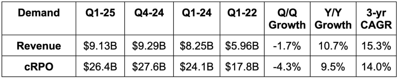- Missed 11% Y/Y current remaining performance obligation (cRPO) growth guidance by 100 basis points (bps; 1 basis point = 0.01%).
