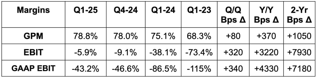 - Beat 77.5% gross profit margin (GPM) estimate & beat same guidance by 130 bps. Scale and cross-selling continue to power the GPM leverage.