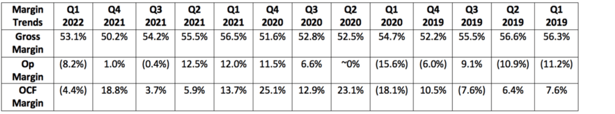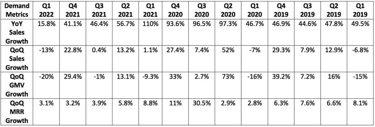 - Shopify’s Q1 2022 GAAP net income margin was (125%) vs. 127.3% YoY and (26.9%) QoQ. This crazy volatility is not unit-economics related in the least -- it is entirely related to unrealized fluctuations in the value of its equity investments. This is not a super important profit metric to track for the company for now -- so I left it out of the table.