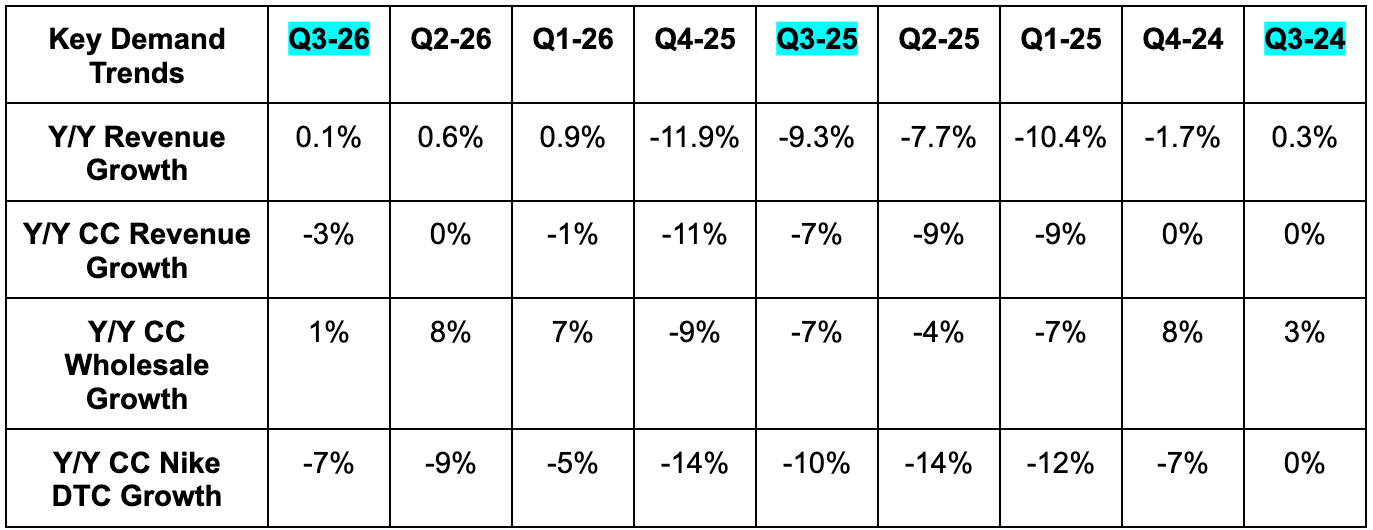 - EPS fell from $0.54 to $0.35 Y/Y. It's worth noting that Nike's effective tax rate was 20% vs. 5.9% last year. With a stable year-over-year tax rate, EPS would have been $0.41.