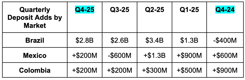 It was good to see deposit growth in Mexico turn positive once more. As a reminder, last quarter, they cut deposit yields paid to focus on monetization and margin a bit more than solely pursuing growth. They built a large base of customers and deposits and felt they were in a strong position to shift the prioritization slightly to profitability.