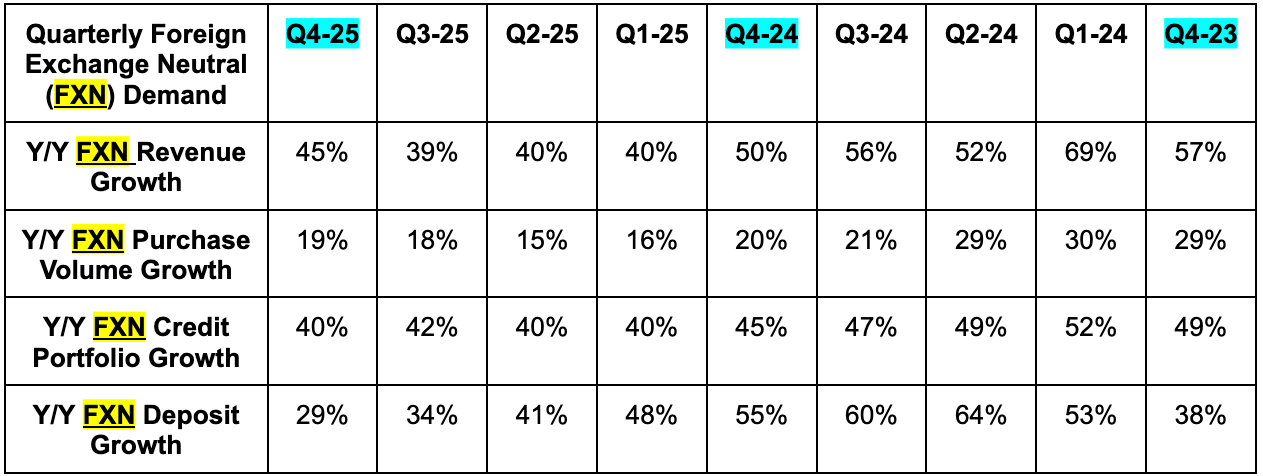 - 45% Y/Y foreign exchange neutral (FXN) growth was well ahead of 41% growth expectations.