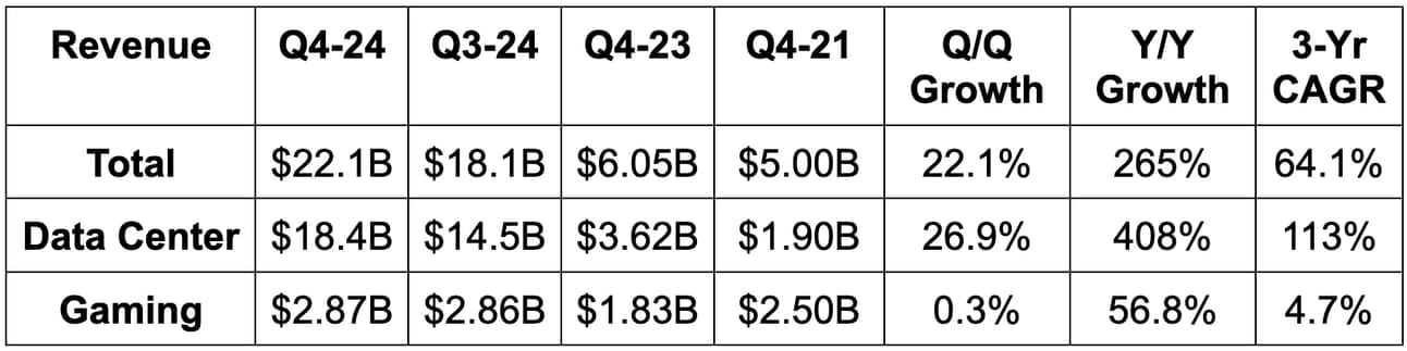 Nvidia beat revenue estimates by 7.5% & beat its guidance 10.5%. Its 64.1% 3-year revenue compounded annual growth rate (CAGR) compares to 56.4% as of last quarter & 51.7% 2 quarters ago. For revenue buckets besides data center: