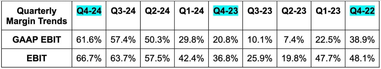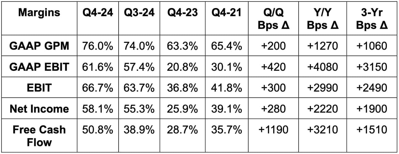 • Share count is down slightly Y/Y. It bought back $9.5 billion in stock during fiscal 2024.