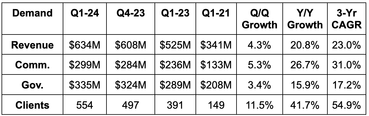Palantir beat revenue estimates by 2.8% & beat revenue guidance by 3.3%. Excluding SPAC-related revenue, overall growth would have been 24% Y/Y. Revenue from its top 20 customers rose 9% Y/Y to $55 million on average; Net Revenue Retention (NRR) improved to 111% vs. 108% last quarter; it closed 15 $10 million+ deals vs. 21 Q/Q. Remaining performance obligations (RPO) rose 38% Y/Y to $1.3 billion. This is a key forward-looking demand metric, which looks quite strong at the moment.