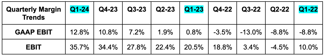 - Beat EBIT estimates by 14.6% & beat EBIT guidance by 14.4%