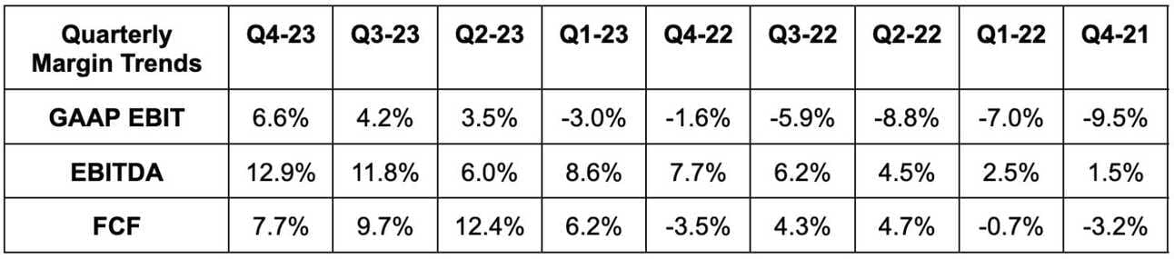 Uber trades for 40x 2024 earnings and 32x 2024 free cash flow. Earnings are expected to grow by 44% Y/Y on a non-GAAP basis and by 198% Y/Y on a GAAP basis. Free cash flow is expected to grow by 60% Y/Y.