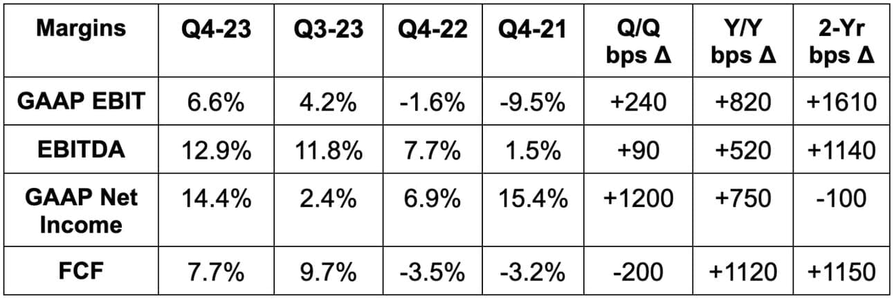 - Share count rose 3% Y/Y. The team all but told us that it would announce a buyback at its investor day next week.