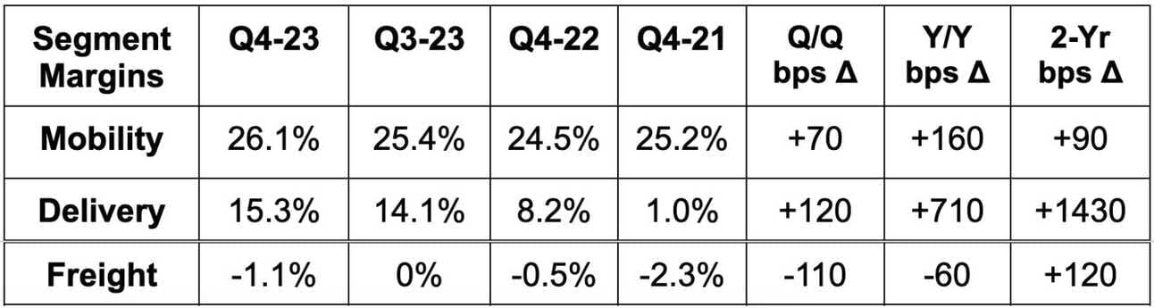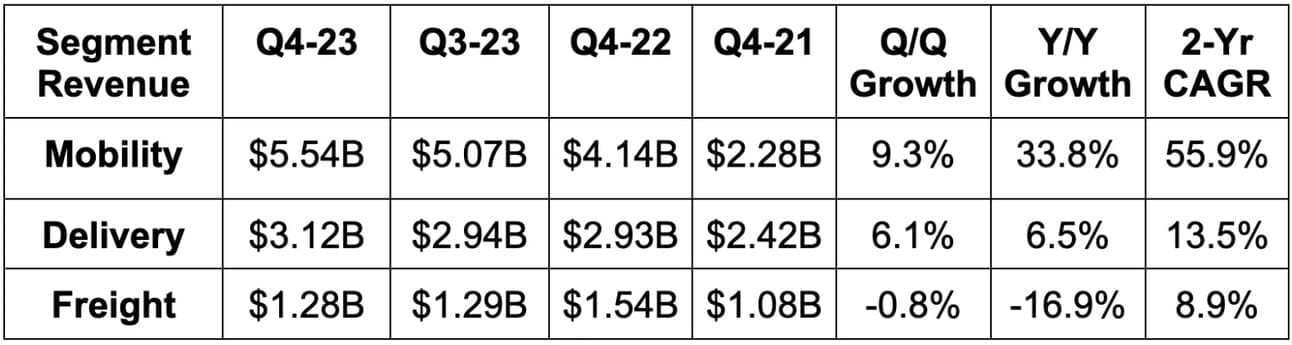 - Mobility revenue rose 31% Y/Y FXN; delivery revenue rose 4% Y/Y FXN; freight revenue fell 17% Y/Y FXN.