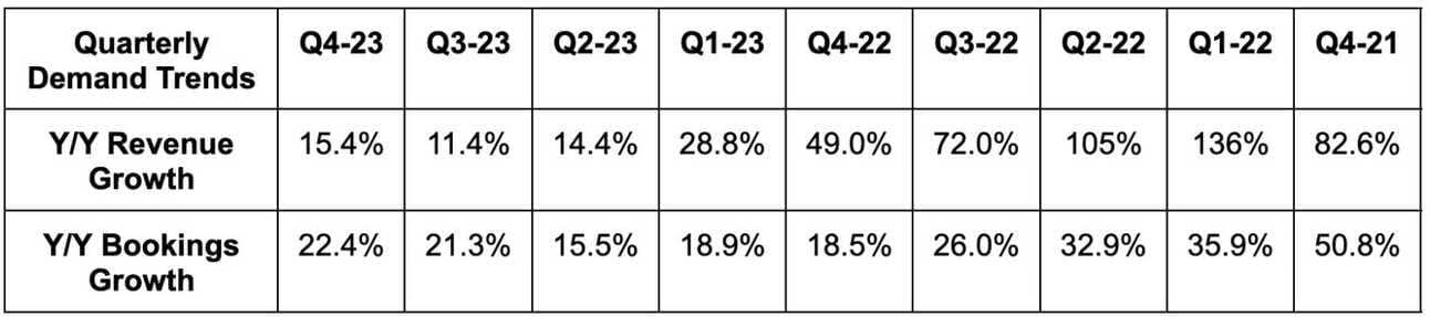 Uber beat bookings estimates by 1.3% & beat bookings guidance by 1.6%. It also beat revenue estimates by 1.8% and beat monthly active user (MAU) estimates by 1.4%. It roughly met foreign exchange neutral (FXN) Y/Y growth guidance across its segments. A business model change in the UK made it classify some sales & marketing spend as a contra-revenue item. This slowed delivery & mobility revenue growth by about 700 bps Y/Y. Comps will normalize in 2024.