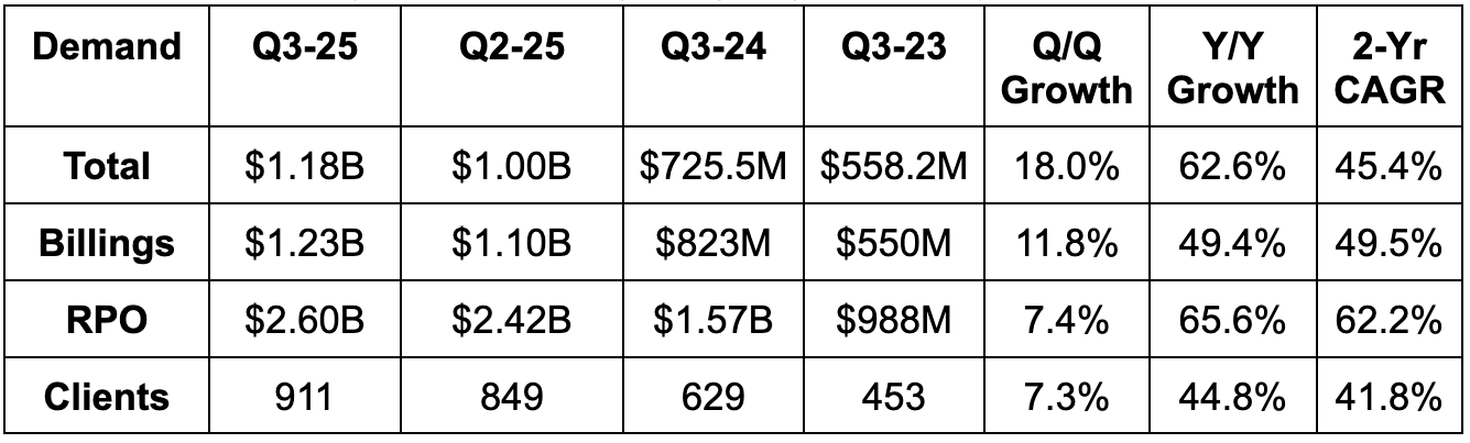 These numbers are ridiculously good… again. $1M+ deals doubled Y/Y while $5M+ deals 5Xed. Total Contract Value (TCV) bookings rose by 151% to $2.8B, eclipsing last quarter’s record by a full 18%. U.S. Commercial TCV bookings rose 342% Y/Y, crushing previous quarterly records. Revenue from its top 20 customers rose 38% Y/Y to $83M, while overall customer growth modestly surpassed expectations once more. Remaining Deal Value (RDV) rose by 91% Y/Y (U.S. commercial +199% Y/Y), pointing to demand remaining overwhelmingly strong for this company going forward. And while net dollar retention continues ramping to a now elite 134%, they think that’s going higher. Any metric we look at here will make your jaw drop like it has for the last year. This is the company monetizing the app layer of the AI opportunity better than anyone else on the planet. And it is not particularly close, either. To do all of this while also delivering 10+ points of Y/Y operating leverage is truly bonkers.