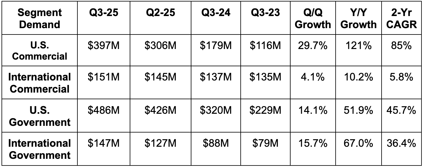 The U.S. Army sent a memo for all Army orgs to “consolidate and centralize on Vantage, which is its AIP and Foundry-based platform purpose built for the Army. This will accelerate the replacement of old systems and will unlock more budget for PLTR products. Across the pond, International government growth was again powered by the UK.