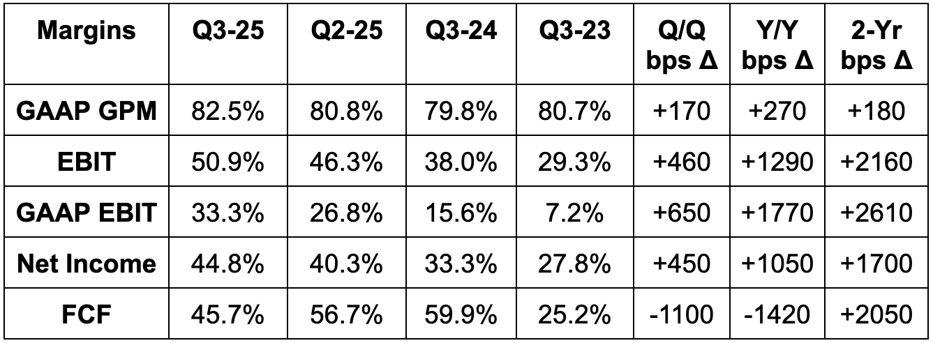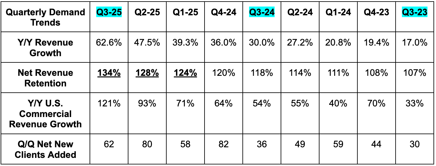 These numbers are ridiculously good… again. $1M+ deals doubled Y/Y while $5M+ deals 5Xed. Total Contract Value (TCV) bookings rose by 151% to $2.8B, eclipsing last quarter’s record by a full 18%. U.S. Commercial TCV bookings rose 342% Y/Y, crushing previous quarterly records. Revenue from its top 20 customers rose 38% Y/Y to $83M, while overall customer growth modestly surpassed expectations once more. Remaining Deal Value (RDV) rose by 91% Y/Y (U.S. commercial +199% Y/Y), pointing to demand remaining overwhelmingly strong for this company going forward. And while net dollar retention continues ramping to a now elite 134%, they think that’s going higher. Any metric we look at here will make your jaw drop like it has for the last year. This is the company monetizing the app layer of the AI opportunity better than anyone else on the planet. And it is not particularly close, either. To do all of this while also delivering 10+ points of Y/Y operating leverage is truly bonkers.