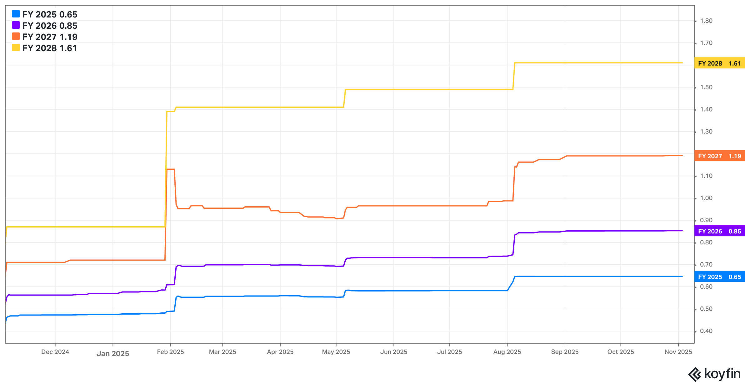 PLTR trades for 97x… yes 97x forward sales. It also trades for 280x forward EPS, as the sky-high sales multiples is a bit offset by sky-high margins. Those margins depend on differentiation-based pricing power that looks quite strong for Palantir right now. Estimates will sharply rise following this report, which will lower the forward multiple a bit too. It’ll still be extremely elevated, but worth noting. EPS is expected to grow by 58% this year and by 35% over 2026-2027 (pre-revisions).