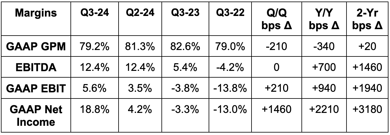 - Its 79.2% gross margin beat 79.0% estimates by 20 basis points (bps; 1 basis point = 0.01%). GPM fell Y/Y due to investments in its newer weight loss business as expected.
